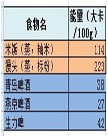 我们不妨做一个计算,看一下啤酒的能量与米饭or馒头相比怎么样?下图是主食与两种常见的啤酒能量值。